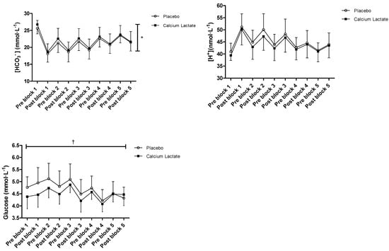 There was no main effect of Treatment on [Glucose] (p = 0.097, η2p = 0.197) and no Treatment × Block × Time interaction effect (p = 0.642, η2p = 0.046). There was, however, a Treatment × Block interaction effect (p = 0.028, η2p = 0.246), with less of a decline in [Glucose] observed in the calcium lactate group compared to the placebo group over the course of the exercise blocks.