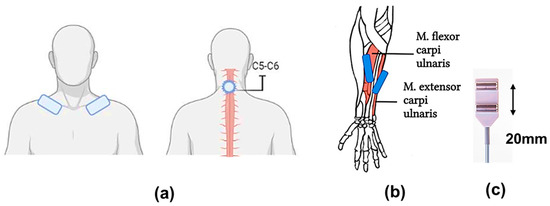 Experimental conditions: (a) tSCS: placement of the stimulating tip electrode (cathode) between the spinous processes of the C5 and C6 vertebrae and the rectangular electrode (anodes) symmetrically on the clavicles; (b) placement of surface electrodes for withdrawal of motor responses on the abdomen of the studied muscles: m. flexor carpi ulnaris, m. extensor carpi radialis; (c) surface electrodes with a fixed interelectrode distance of 20 mm.
