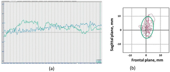 Recording examples: (a) Stabilogram of fluctuations in the center of pressure in the frontal plane (blue line) and in the sagittal plane (green line) of the “eyes open” position; (b) Example of a participant’s statokinesiogram. Statokinesiogram with mathematical processing of fluctuations in the center of pressure and construction of an ellipse describing 90% of the surface occupied by the statokinesiogram and reflecting the area of the subject’s support during the examination. The irregularly shaped line inside and outside the ellipse is the statokinesiogram. The side of the cell is equal to 10 mm.