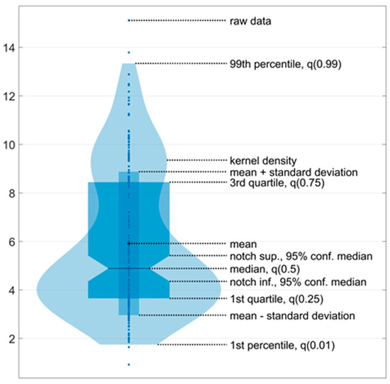 An example of a violin plot. The violin plots show the kernel probability density of the underlying data at different values. The violin plots include a marker for the median, the mean of the data, and a box indicating the interquartile range, as in standard box plots.