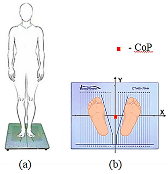 On the stabilographic platform, on which a person is in a standing position, force sensors that measure the reaction of the person’s foot support are attached. The two-coordinate computer platform ensures the recording and analysis of the trajectory of the center of pressure (CoP) exerted by a person on the horizontal working surface of the force-coordinate platform. The registration CoP fluctuations and all calculations were provided by the corresponding software of the StabMed 2 stability analyzer.