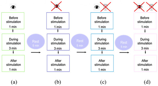 (3) A stabilography test was conducted under the following conditions for all participants: (1) a 1-minute trial without stimulation; (2) for 3 minutes with stimulation; and (3) for 1 minute without stimulation immediately after stimulation. In each session, we conducted a total of four tests (Figure 6).