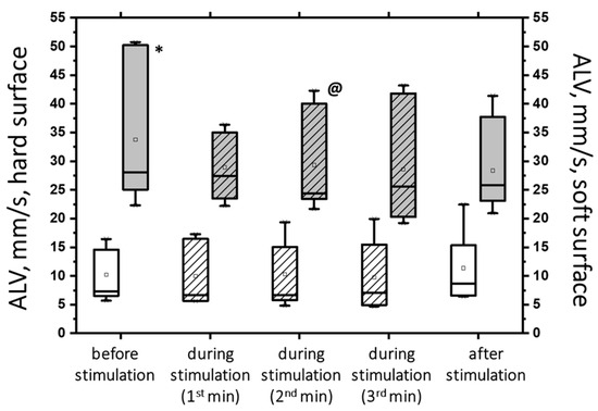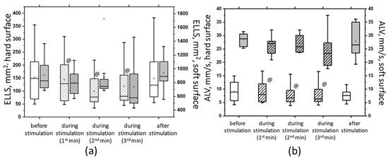 The area of ellipse (ELLS) (a) and the average linear velocity (ALV) (b) in the closed-eye test on a hard surface (white bars) and a soft surface (gray bars) before, during, and after tSCS at 30 Hz with subthreshold stimulus intensity; the data collected during stimulation were divided into three equal one-minute intervals (bars with slashes). The data are presented in box-and-whisker plots, where the boundaries of the boxes indicate the 1st and 3rd quartiles, and the whiskers extend 1.5 interquartile ranges above and below. The solid black lines indicate the median, and the dots indicate the mean; @—p < 0.05 relative to the values before stimulation.