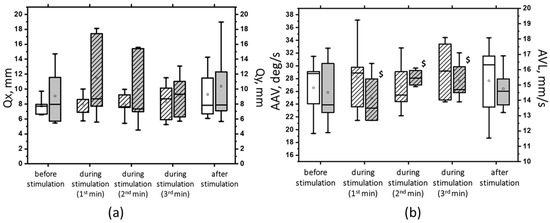 The root-mean-square deviation of the CoP along the frontal (Qx, white bars) and sagittal (Qy, gray bars) planes in the sample with eyes closed on a soft surface (a); the average linear velocity (ALV, white bars) and the average angular velocity (AAV, gray bars) of the deviation of the CoP in the sample with closed eyes on a soft surface (b) at 5 Hz suprathreshold tSCS; the data during stimulation were divided into three equal one-minute intervals (bars with slashes). The data are presented in box-and-whisker plots, where the boundaries of the boxes indicate the 1st and 3rd quartiles, and the whiskers extend 1.5 interquartile ranges above and below. The solid black lines indicate the median, and the dots indicate the mean; $—p < 0.05 vs. values of indices at subthreshold tSCS.