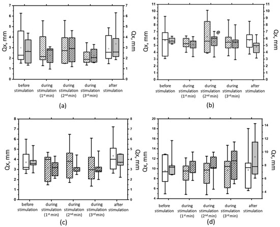 The root-mean-square deviation of the center of pressure along the frontal axis (Qx) in the eyes-open test on a hard (a) and a soft (b) surface and in the eyes-closed test on a hard (c) and a soft (d) surface before, during, and after tSCS at 5 Hz with subthreshold stimulus intensity (white bars) or suprathreshold stimulus intensities (gray bars). The data collected during stimulation were divided into three equal one-minute intervals (bars with slashes). The data are presented in box-and-whisker plots, where the boundaries of the boxes indicate the 1st and 3rd quartiles, and the whiskers extend 1.5 interquartile ranges above and below. The solid black lines indicate the median, and the dots represent the means. @ p < 0.05 relative to the values before stimulation.