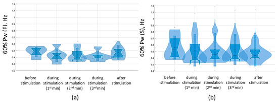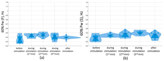 At a suprathreshold 30 Hz TSCS stimulus strength during the eyes-closed test on a soft surface, 60% Pw decreased toward lower frequencies, measuring 0.5 [0.5; 0.7] Hz in the sagittal plane and 0.5 [0.5; 0.7] Hz in the frontal plane. This shift occurred due to a decrease in the proportion of Pw4(S) to 8.9 [7.2; 11.3]% and a decrease in the proportion of Pw4(F) to 7.8 [6.5; 10.2] % (Figure 16, Table S6, Supplementary Materials).