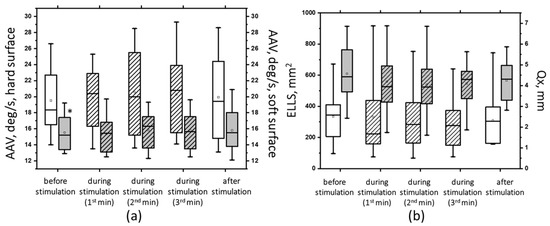 The average angular velocity (AAV) in the test with closed eyes on a hard (white bars) and soft (gray bars) surface (a); the area of the ellipse (ELLS, white bars) and the root-mean-square deviation of the CoP along the frontal plane (Qx, gray bars) in the test with closed eyes on a soft surface (b) before, during, and after tSCS at 30 Hz with subthreshold stimulus intensity; the data during stimulation were divided into three equal one-minute intervals (bars with lines). The data are presented in box-and-whisker plots, where the boundaries of the boxes indicate the 1st and 3rd quartiles, and the whiskers extend 1.5 interquartile ranges above and below. The solid black lines indicate the median, and the dots indicate the means; *—p < 0.05 relative to the values on the hard surface.