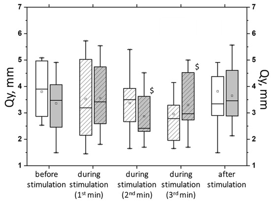 The root-mean-square deviation of the center of pressure along the sagittal plane (Qy) in the closed-eyes test on a hard surface before, during, and after tSCS at 30 Hz with subthreshold stimulus intensity (white bars) or suprathreshold stimulus intensities (gray bars); the data collected during stimulation were divided into three equal one-minute intervals (bars with slashes). The data are presented in box-and-whisker plots, where the boundaries of the boxes indicate the 1st and 3rd quartiles, and the whiskers extend 1.5 interquartile ranges above and below. The solid black lines indicate the median, and the dots represent the means. $—p < 0.05 relative to the values between the subthreshold and suprathreshold tSCS.