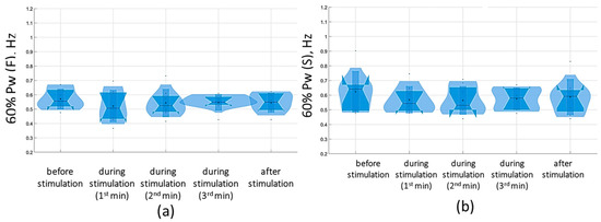 Five violin plots were generated before, during, and after stimulation. Additionally, the data collected during stimulation were divided into three equal one-minute intervals. Accordingly, all five signals, each with a duration of one minute, were processed in accordance with the aforementioned methodology. The violin plot enabled the evaluation of two key aspects of the data: the kernel density, which is represented by the ‘violin’ shape, and the data density at a specific point, which is reflected in the ‘violin’ width at that point.