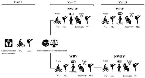 Data were collected across three separate visits, with a 48 h interval between them, coinciding with the athletes’ regular training periods. In the first session, subjects signed the informed consent form, underwent anthropometric assessment, and were familiarized with the evaluation method for the mawashi geri. In the second visit, block randomization was implemented. The first participant was randomly assigned to a condition, and the subsequent participant was assigned to the opposite condition, with this process continuing for all participants. The application of experimental conditions was randomized, with one condition involving Whole-Body Vibration (WBV) and another without WBV (NWBV). For the third visit, the experimental conditions were counterbalanced. Each intervention was preceded and followed by an evaluation of the mawashi geri, as illustrated in Figure 1. All study procedures were performed in a climate-controlled laboratory environment, with temperatures maintained between 20 and 24 °C.