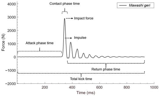 The Matlab® software R2017a was used for signal processing and analysis of the following dynamic variables: impact force (determined as the maximum perpendicular value on the device surface) and impulse (calculated as the integral of the force with respect to the contact time). The total execution time of the kick was divided into attack, contact, and return phases, measured from the foot losing contact with the contact mat on the ground until it touched the contact mat again. The kick variables are represented in Figure 3.