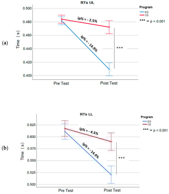 Mean scores for Reaction Time simple Upper Limb (RTsUL) (a) and Reaction Time simple Lower Limb (RTsLL) (b). Experimental group vs. control croup (EG vs. CG), pre- and post training. Error bar: 95% CI. ip%= increase percentage; (s) = second.
