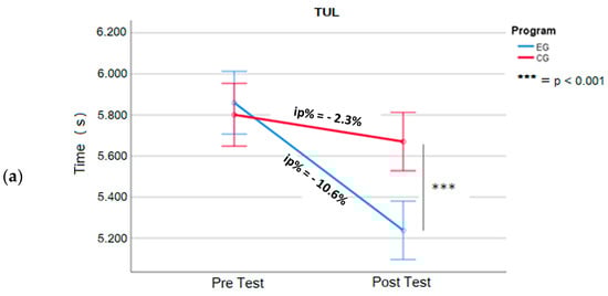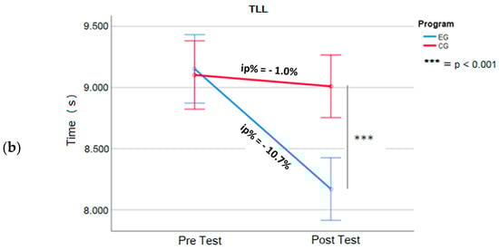 Mean scores for Tapping Upper Limb (TUL) (a) and Tapping Lower Limb (TLL) (b). Experimental vs. control group (EG vs. CG), pre- and post training. Error bar: 95% CI. ip%= increase percentage; (s) = second.