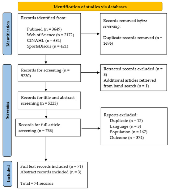 In total, 5223 articles were screened, with 71 full articles and three abstracts [39,40,41] included in the final analysis. The majority of studies were conducted in the USA (n = 59), with a large emphasis on high school and collegiate populations (n = 32). Included studies used the KD (n = 34), the VOMs in conjunction with independent use of the NPC assessment (n = 28), or alternative tools and emerging technologies (n = 19). Only four studies included active military personnel. Studies were mostly mixed sex (n = 51), and only one study included a female-only population. Findings for the KD, VOMS/NPC, and alternative tools and technologies are discussed in three succinct sections below. Further information on each study’s aims are available in Supplementary File S1 (Tables S1.1–S1.6).
