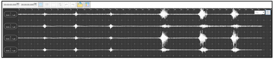 The received data were converted into an Excel spreadsheet for further processing. The native EMG curve was full-wave rectified and smoothed with a constant of 200 ms (Figure 3).