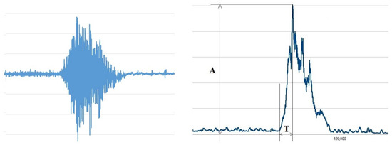 Native EMG (left) and measured parameters (right). Where are “A”—amplitude (μV), “T”—time (ms).