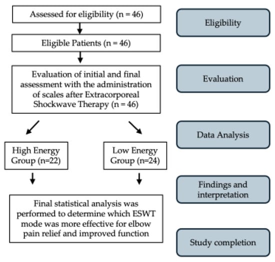This observational study followed good clinical practice and the ethics of the Helsinki Declaration, approved by La Sapienza University’s Institutional Review Board (Prot. 0000/2024—Approval Date: 15 February 2024). Informed consent forms were signed by all patients, and the data were anonymized. All participants provided signed informed consent before the study, which included a specific section regarding the processing of their personal data for research purposes, ensuring anonymization to safeguard their privacy. The data of patients treated for symptomatic lateral elbow pain between 2021 and 2024 were retrospectively collected and analyzed. LE was diagnosed based on clinical symptoms, physical examinations, and imaging studies. To be study eligible, patients had to be between 25 and 85 years old, have had pain in the epicondyle are of the lateral epicondyle (Figure 1), with symptoms over the last 3 months, with reduced range of motion (ROM), and present with a positive tendinopathy epicondylitis test. Patients were excluded if they had marked atrophy or weakness at any forearm muscles, if they had previously undergone elbow-region surgery, if they had recent corticosteroid or nerve blockage injections, if there was a tumor in the treatment area, if they were pregnant, or if they had any coagulation abnormalities. All eligible patients completed a demographic and clinical questionnaire that assessed age and gender. The following scales were administered at T0 and at T1 after three months and at T2 after 6 months from ESWT: A visual analog scale (VAS) [32] and Patient-Rated Tennis Elbow Evaluation Questionnaire (PRTEE) [33]. All ESWT applications and survey administration were performed by the primary investigator, a physician specialized in physical medicine and rehabilitation. Participants were instructed not to consume NSAIDs during the study period, and they were asked to report any intake including self-medication on demand. The flow diagram of the study is shown in Figure 2.