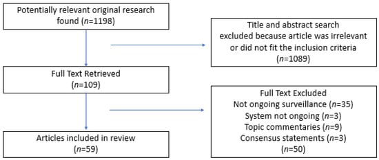 From the original 1198 papers returned through database searches, a total of 109 full-text articles were reviewed, with 50 of these being excluded. Thirty-five of these described systems that were not ongoing surveillance, three were no longer in use, nine were topic commentaries and three were consensus statements. Figure 2 shows the results of the searches.