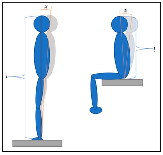 The center of pressure (CoP) was measured using a force plate, and back extension strength was measured using a corresponding power machine. From a biomechanical perspective, the two assessments—sitting and standing—are comparable. Essentially, both variants of the CoP trajectory can be considered as a single inverted pendulum. The difference in trajectory length between the variants represents a linear relationship. For approximately the same pendulum angle of the upper body, the shorter pendulum results in a shorter path over the force plate. Due to the larger support surface in the seated position, it can be assumed that the angle of deflection at the hip joint is not greater than the angle of deflection at the ankle joint in the standing position [17,18]. Refer to Figure 1 for further illustration.