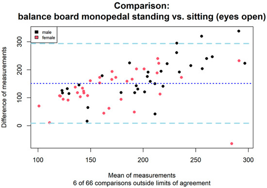 Mean difference plots were constructed to compare measurements taken in the standing and sitting positions on the balance board. The mean difference plots showed good agreement between the two instruments. The deviation between the standing and sitting measurements was 9.1% (Figure 3). This is below our pre-determined acceptable deviation of ten percent, so the standing and sitting measurements were in good agreement. Furthermore, the CoP fluctuation measurements in (a) standing and (b) sitting positions had a positive Spearman correlation coefficient of 0.47. Both methods of measuring CoP fluctuation showed a comparable Spearman correlation to the additionally obtained extension force measurements in Nm/kg (a: 0.24, b: 0.23). Although there was a low correlation between CoP fluctuation in the seated position and strength, this was also true for CoP fluctuation values in the standing position (standard measurement). Subjects with low or high extension force values (split by mean extension force value at 3.32 Nm/kg) measured in the sitting position showed a significant difference in mean values (Welch t-test—mean1: 100.8 cm, sd1: 31.5 cm, mean2: 122.2 cm, sd2: 49.1 cm, t = −2.06 (95%-CI −42.3/−0.6), p = 0.044).