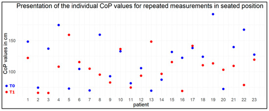 The equivalence of the individual measurements was demonstrated by the TOST test on the CoP fluctuation values for subjects in the sitting position (equivalence bound 58 cm, mean of the differences: 12.87 cm, p < 0.001). The null hypothesis that there was an effect large enough to be of interest was rejected. Therefore, there is no reason to believe that the measurements at the two time points are significantly different (see also Figure 4).