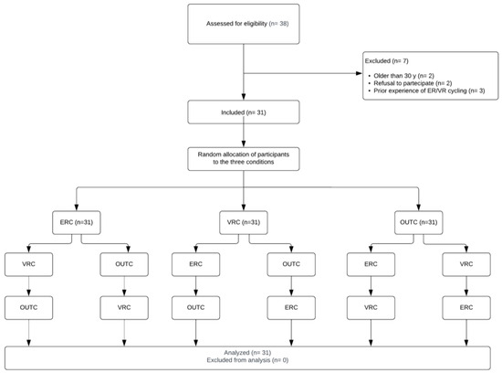 Participants were recruited from the local fitness center, Polignano a Mare, Bari, Italy (Living S.S.D.), selecting only university students aged between 18 and 30 years. We considered the following exclusion criteria: (1) declining to take part in the study, (2) indications of musculoskeletal disorders or significant lower limb injuries, (3) acute or chronic disease, (4) taking medications that may affect mood and cognitive regulation, (5) habitual performance of physical/sporting activity in an outdoor setting, (6) prior experience in using ER-cycling and/or VR-cycling technologies.