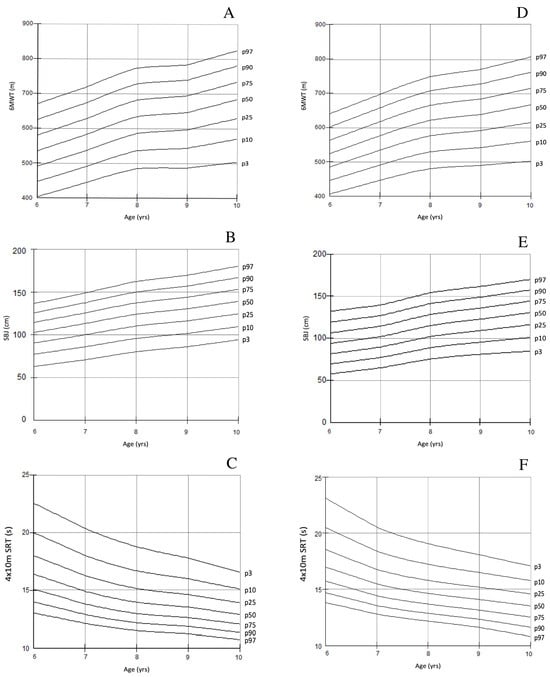 Age-dependent percentiles for the 6MWT (A,D), SBJ (B,E), 4 × 10 m SRT (C,F) in boys and girls.