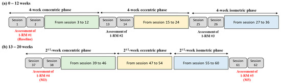 The detailed resistance-training program protocol conducted in this study involved three supervised weekly sessions spread over a 20-week period, conducted in a fully equipped university sports center dedicated to strength training. The 20-week program encompassed concentric, eccentric, and isometric phases, which were successively repeated periodically at 2- and 4-week intervals throughout this study. Each session included four exercises, totaling eight different exercises over the program duration (Table 1).