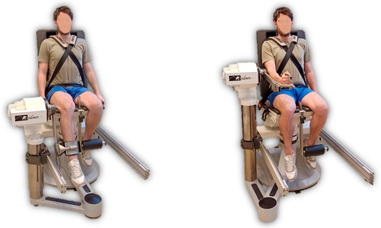 Isokinetic testing was assessed using an isokinetic Con-Trex® isokinetic dynamometer (Con-Trex MJ; CMV AG, Dübendorf, Switzerland). The testing apparatus was set up as described in the manufacturer’s manual and participants were positioned in the seated position for knee flexion/extension testing and elbow flexion/extension testing (Figure 2).