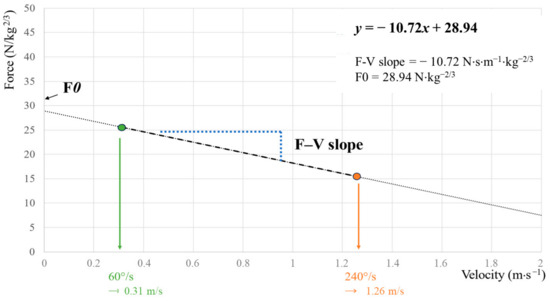 PTs and angular velocities were converted to force and linear velocity by dividing or multiplying, respectively, the value by the radius, which corresponded to the subject’s lever arm length. Force values were normalized to body size (N/kg2/3) and body mass was assessed with a mechanical flat scale (Seca 750, Hamburg, Germany). The theoretical maximum force (F0) was calculated by extrapolating the regression line to its limits (i.e., zero velocity) and the slope of the relationship was calculated as the slope of the regression line (F-V slope, in N·s·m−1·kg−2/3) (Figure 3.) [17,20]. The F-V slope represents the index of the athlete’s individual balance between force and velocity capabilities with a steeper slope corresponding to a more “force-oriented” F–V profile [3].