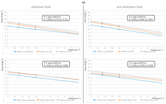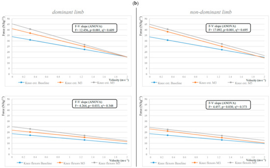 There was a significant decrease in F-V slope, corresponding to a steeper slope, for knee extensors and flexors on both dominant and non-dominant limbs with effect sizes classified as large (η2 > 0.14, 0.348–0.695) (Figure 4). Post hoc analysis showed a significant increase (p < 0.001–0.010) between Baseline and M3 or M5 for knee flexors and knee extensors.