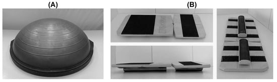 On the one hand, the BOSU® is a device that combines a solid round base with an inflatable air chamber, simulating a split Swiss ball. Both parts can be used to work stability in a different way [], demanding the inversion-eversion movement. On the other hand, the Blackboard is another device designed for stability training that consists of two wooden boards joined together by a tape. Its base has a Velcro surface where you can freely place half -cylinder wooden slats. Depending on the position where they are placed, one or another type of instability training is generated. Both devices are illustrated in Figure 1.