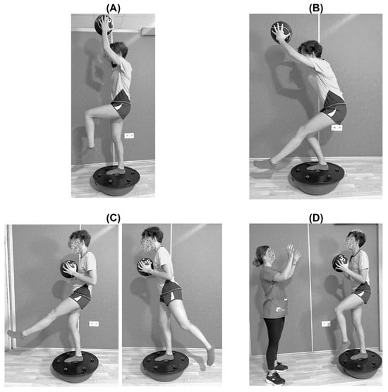 The exercises were the same for both groups and were performed with a 3-kg medicine ball, with the only difference being the unstable surface device []. These exercises were as follows: (1) A 30-s series of maintaining the single-leg stance position with an extended knee and hip, holding the ball with the arms stretched out above the head; the free leg was kept at 90° hip and knee flexion. (2) A series of 10 repetitions where the subject was asked to move from the supporting-leg hip and knee starting position to a 90° knee flexion squat, keeping the ball above their head and maintaining the other leg with the knee and hip at about 90° flexion. (3) A single series of 10 repetitions where the subject started with full limb extension of the supporting leg and the ball held with both hands at chest height; from this position, subjects were asked to bring the free leg from 45° hip extension to 45° hip flexion. (4) 10 passes between the subject and a partner where the participants started with a total extension of the supporting limb and the ball held in both hands in front of them at chest height, and their free leg flexed 90° at the hip and knee. A 2-min rest between exercises was allowed. These exercises are illustrated in Figure 2.