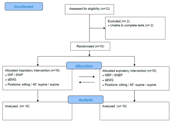 Of the initial cohort of 12 people, two were excluded because they were unable to complete all the tests. Consequently, the study comprised 10 participants, equally divided between five males and five females (Figure 1). Table 1 shows the clinical, anthropometric, lung function and respiratory muscle strength characteristics of the sample.