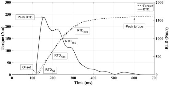 For the IKE, the signals were exported to a spreadsheet and finally processed through the MATLAB software by a routine created by the authors (R2021a; The MathWorks, Inc., Natick, MA, USA). The signal was resampled to 1000 Hz. The signal was filtered by a Butterworth low-pass filter of 4 orders with zero lag and a cut frequency of 20 Hz []. The first value at 1 newton was identified as the start of the test. For the analysis, the following variables were used: peak torque, RTD in windows of 50 ms up to 200 ms, and the instantaneous isometric peak RTD (PRTD). The attempt with the highest peak force was used for the analysis. The signal shape and variables are given visually in Figure 2.