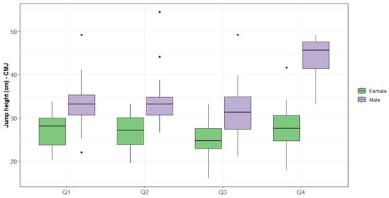 Within the CMJ jump profile, there were relevant differences between genders for the profile exhibited by CMJ jump variables, controlling for age quartiles (p = 0.000). Considering the analysis, both the female and male gender in Q4 had the highest results for the jump height variable, while Q3 had the lowest values for this variable (Figure 1).