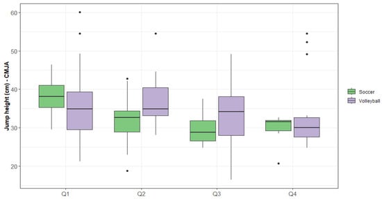 CODS agility showed significant differences within the same year, revealing that athletes born in the first two quartiles performed better than those in the last quartiles. Similar results were found by [], who conducted a 30 m agility test. Moreover, [] found significant differences between genders for speed (20 m) and CODS agility, corroborating the findings of this study. In line with the study by Ek et al. [], the comparison between sports for the countermovement jump did not show significant differences between quartiles of relative age, expressing p < 0.12. However, contrary to this, the current study determined differences between sports for countermovement jumps in SJ and CMJA regarding power and jump height. The study by Sandercock et al. [], which found better results for athletes born in November in cardiorespiratory fitness, strength, and power, did not align with the current study’s results. In this study, soccer players born between January and March (Q1) achieved superior results compared to Q4 in volleyball. When considering gender, significant differences (p = 0.000) were found, with male athletes in Q1 achieving greater jump heights than female athletes in Q4.