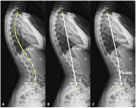 (A–C) Illustrations on a lateral EOS radiograph of the length of the thoracolumbar spine (LTOT), the height of the thoracolumbar spine (HTOT), the height of the thoracic spine (HTHOR), and the height of the lumbar spine (HLUMB).