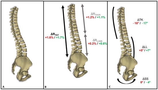 (A) Example of a 3D reconstruction of the thoracolumbar spine and pelvis in the neutral position; (B,C) 3D reconstruction of the spine and pelvis during the trunk self-elongation position, with average changes in the (B) ratio of thoracolumbar spine height (ΔRTOT), thoracic spine height (ΔRTHOR), and lumbar spine height (ΔRLUMB); and (C) sacral slope (ΔSS), lumbar lordosis (ΔLL), and thoracic kyphosis (ΔTK). Font color: red for non-athletes; green for gymnasts.