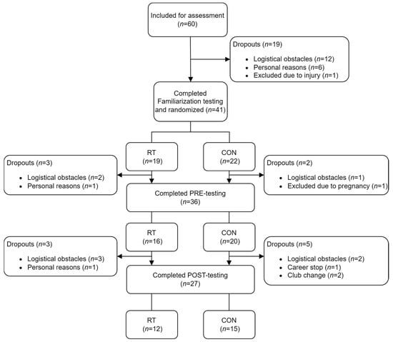 Elite team handball players from four clubs in the Danish Women’s Handball League were recruited for this study. After written and oral information, 60 elite female team handball players agreed to participate in this study. Participants were excluded if they had been absent from team handball training for more than two weeks due to injuries within the six months preceding PRE-testing or if they sustained injuries during the intervention period. Additionally study participants were excluded from the study if they became pregnant or ceased to play team handball at elite level. A total of 33 players withdraw from the study during the intervention period due to career stops, club changes, injuries, pregnancies, logistical obstructions on test days, or personal reasons (Figure 1). Twenty-seven players (RT n = 12, CON n = 15) were assessed in this study.