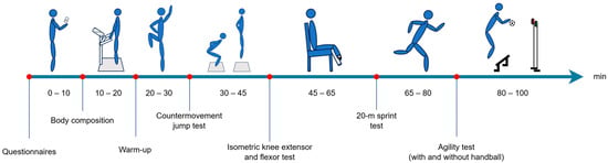 On-field test protocol. Timeline and order of evaluated tests. Study participants filled out an online questionnaire before having their body composition measured. Warm-up procedures were completed before engaging in countermovement jump test, isometric knee extensor and flexor test, 20 m sprint test, and agility test with and without handball.