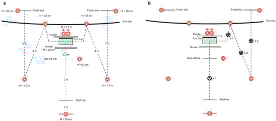Agility performance was evaluated using a specific team handball game-based test developed by Team Danmark (the Danish Elite Sports Institution) in close collaboration with DanskHåndbold (the Danish Handball Federation) (Figure 2). In brief, motion and impact sensors (FITLIGHT TrainerTM, FITLIGHT Sports Corp., Aurora, ON, Canada) were used to evaluate agility performance. Participants initiated the test by removing their hand from the start sensor positioned 1-m behind the start line. Subsequently, participants ran for 3 m, before jumping over a 20-cm high hurdle and landing within a 100-cm × 50-cm box with toes oriented forward. While in the air, a directional light, either to the right or left, was displayed for 0.5 s. Following the landing, participants made a sidecut to either the right or left and touched a sensor at a height of 35-cm positioned on the 6-m line. Next, subjects sidestepped for 4-m and touched another sensor at a height of 1.5-m, before concluding the test with a 5-m straight-line sprint to the finish line. First, study participants completed six trials without a handball (see Figure 3a); subsequently subjects completed six trials with handball dribbles (see Figure 3b). Each set of six trials was randomized to either the left or right side. A random sequence of 6 numbers (1–6) was obtained using www.random.org, with unequal numbers being the left and equal numbers being the right side. In trials with handball dribbles, subjects were instructed to take two steps before executing the first dribble, followed by executing one dribble after the landing but before touching the sensor (during the sidecut movement), then executing two dribbles while sidestepping (changing the hand used for dribbles), and executing two dribbles while sprinting towards the finish line (see Figure 3b). The best total time to complete the agility test was chosen for subsequent analysis.