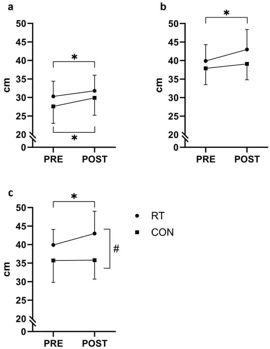 Countermovement jump. (a) Jump height (JH), (b) jump height relative to ground level (JHGL), (c) body center of mass displacement in the concentric (upwards) phase (BCMdisp [Cp]). Mean ± standard deviation values before (PRE) and after (POST) the eight-week intervention period for the resistance training group (RT) and the control group (CON). # p ≤ 0.05 time-by-group interaction effect, * p ≤ 0.05 within-group change.