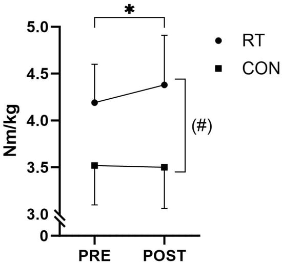 A non-significant time-by-group interaction effect (p = 0.055) for knee extensor MVIC peak torque was observed, with RT participants displaying a significant within-group POST-training change of 0.19 Nm/kg (+4.5% p = 0.044). (Figure 5 and Table 4).