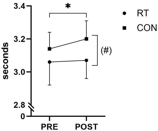 A time-by-group interaction effect (p < 0.001) was observed in the agility test, with RT participants performing faster (−0.18 s, p = 0.008) and CON slower (+0.34 s, p = 0.012), respectively, after the training period (Figure 7 and Table 6).