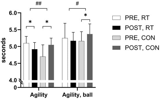 Agility performance. Figure shows means ± standard deviation of time to complete the change of direction test without (agility) and with ball (agility, ball) before (PRE) and after (POST) the intervention period for the resistance training group (RT) and the control group (CON). * p ≤ 0.05 within-group change, # p ≤ 0.05 time-by-group interaction effect, ## p ≤ 0.00 time-by-group interaction effect.