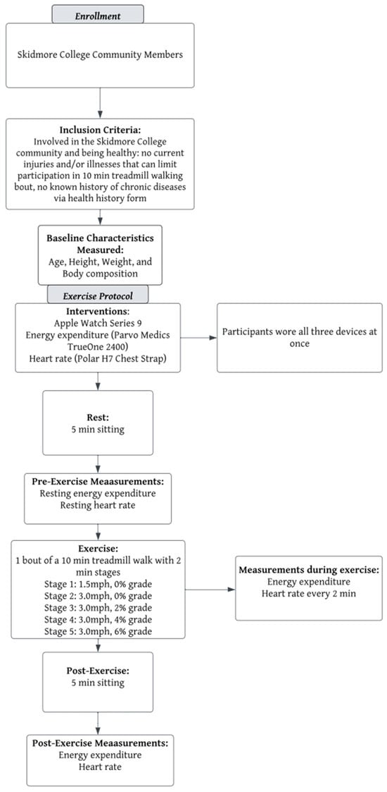 Participants were instrumented with an Apple Watch Series 9 (Apple Inc., Cupertino, CA, USA) that was updated with their age, body weight, and height prior to testing. Participants were asked to place the Apple Watch Series 9 on their left wrist to compare to the measure criterions for EE using a two-way non-rebreathing mouthpiece connected to a Parvo Medics True One 2400 metabolic cart (Parvo Medics, Salt Lake City, UT, USA) [14] and for HR wearing a Polar H7 chest-strap HR monitor (Polar Electro, Kempele, Finland) [15]. Before participating in the 10 min exercise protocol, participants were seated for 5 min to collect resting EE and HR. Participants were asked to walk on a treadmill (TMX-425, Trackmaster, Newton, KS, USA) for a total of 10 min, with 2 min stages of the corresponding speeds and incline grades: 1.5 mph 0% grade, 3 mph 0% grade, 3 mph 2% grade, 3 mph 4% grade, and 3 mph 6% grade. HR was collected continuously but recorded once at each timepoint at the end of each 2 min stage, while EE was collected for the entire final min (again 15 s averages) of each stage and subtracted from the total EE of the previous stage’s final min. Following the exercise protocol, participants were seated for 5 min, where EE and HR were measured.