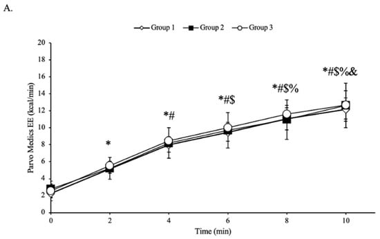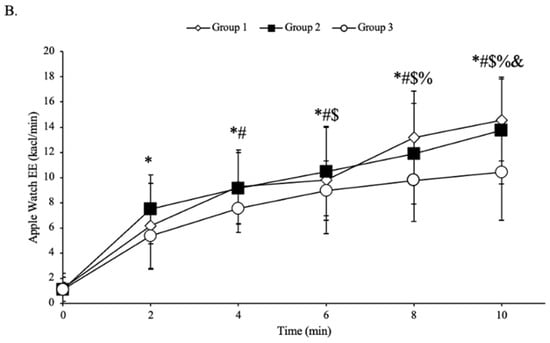 Energy expenditure response in calories per min (kcal/min) of the college-aged participants (N = 30) from the Parvo Medics (panel A) or the Apple Watch Series 9 (panel B) during each stage of the 10-min treadmill protocol. Data presented as means ± standard deviation. * Significant difference from 0 min (p < 0.05). # Significant difference from 2 min (p < 0.05). $ Significant difference from 4 min (p < 0.05). % Significant difference from 6 min (p < 0.05). & Significant difference from 8 min (p < 0.05).