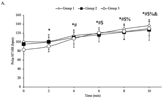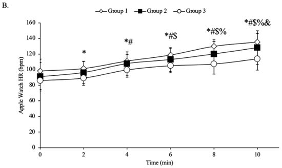 Heart rate response in beats per min (bpm) of the college-aged participants (N = 30) from the Polar H7 (panel A) or the Apple Watch Series 9 (panel B) during each stage of the 10-min treadmill protocol. Data presented as means ± standard deviation. * Significant difference from 0 min (p < 0.05). # Significant difference from 2 min (p < 0.05). $ Significant difference from 4 min (p < 0.05). % Significant difference from 6 min (p < 0.05). & Significant difference from 8 min (p < 0.05).