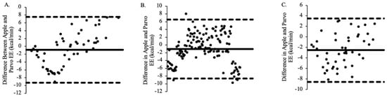 The agreement between Apple Watch Series 9 and Parvo Medics EE for all timepoints for Group 1 (panel A; M = −0.884), Group 2 (panel B; M = −1.020), and Group 3 (panel C; M = −8.529).